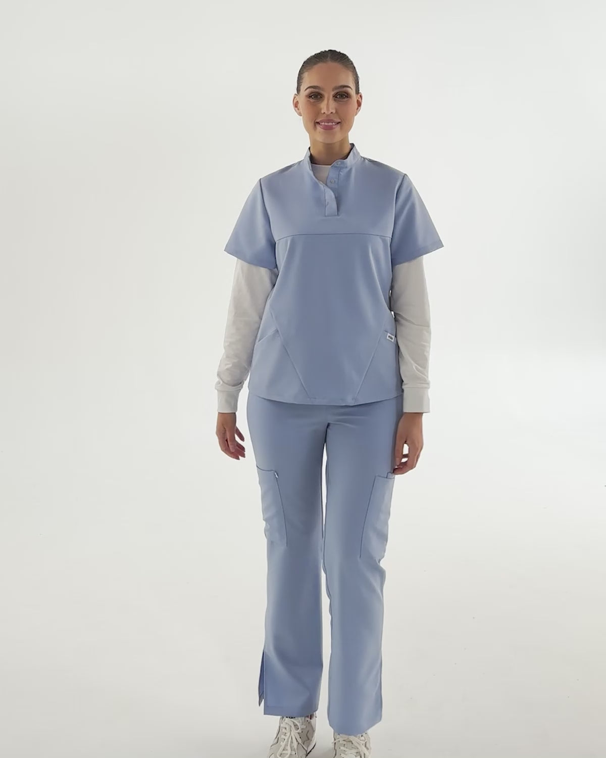 Our June Mandarin Collar Scrub Top is a must have for your professional wardrobe. Featuring a simplistic yet modern classic fit with three easy access pockets to fulfil all your stashing needs while moving with ease in our four-way stretch technical fabric for extra comfort and performance for whatever your day brings.